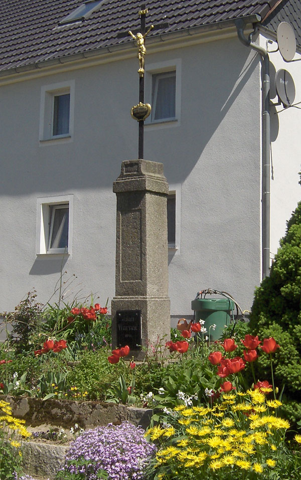 Eine Gasse entlang fahre ich zum Bauerngut der Warnatschs Nr. 23. Die Witwe Mutter Warnatsch begibt sich gern mit mir zum Hl. Kreuz im Garten. Sie erzählt: Dieser Stein ohne Corpus stand vergessen und verlassen zwischen Feldern. Mein verstorbener Mann Jakob Warnatsch hat 1940 den Granitstein im Garten aufstellen lassen und versorgte ein neues Kreuz und Corpus. Schön ist der Spruch auf der Tafel: "Mój Jězu smilnosć". Unten im Stein ist eine schwarze Tafel aus Marmor eingelassen, darauf steht in vergoldeten Buchstaben: Jakub Warnač 1940. Einen schönen Platz hat das Kruzifix im erhöhten Garten. Mit geneigtem Haupt segnet der Erlöser die Familie und das sorbische Dorf. Wundervolle Blumen blühen hier inmitten der Gartenfrüchte. Zwei Söhne fielen im 2. Weltkrieg, der dritte kehrte zurück und starb an den Kriegsfolgen. Heute wächst hier eine neue Familie heran. Zur Mutter sagen wir Agnes Pohl geb. Warnatsch.