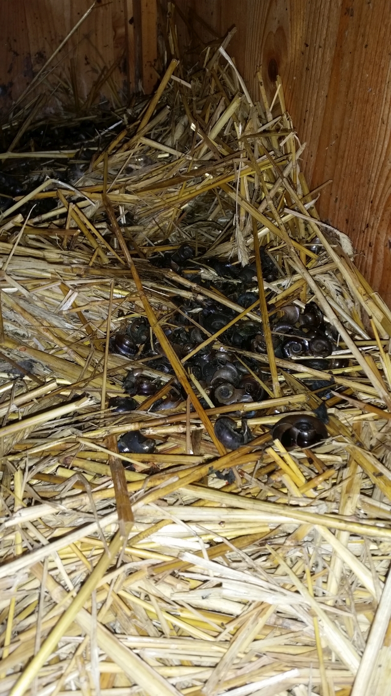 Před tydźenjom smy kačku chězku z hata sćahnyli. Chceće widźeć, kajke w njej wupada? Potym, zo smy w lěću nalehnjene jeja wotstronile a čerstwu słomu zasłali, njejsu wjace kački do njeje zaćahnyli. Ale štó je tam pobył? Tam leži cyła kopica wočinjenych šlinkow z wody (Posthornschnecken).